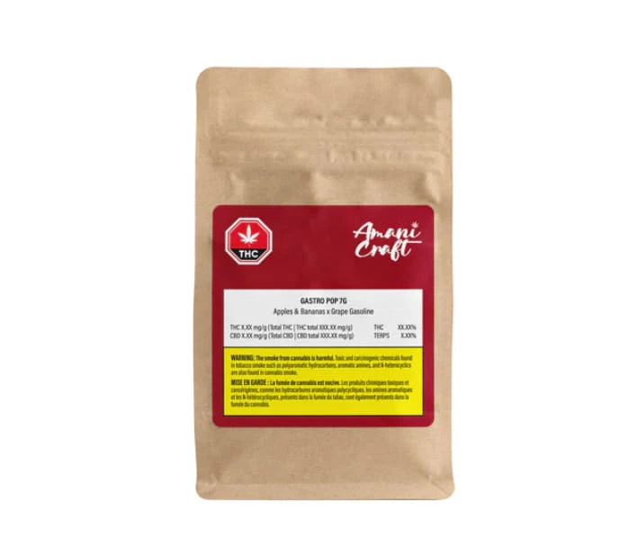 This edition of the Gastropop genetic was bred by Compound Genetics and grown by Amani Craft Cannabis at their indoor facility in Lake Country BC using hydroponics. This indica-dominant cultivar is rich in terpenes, including myrcene, ocimene, and pinene, with notes of grape and gas. The plant's frosty, sticky buds are hand-trimmed, cured for four weeks, and never irradiated.