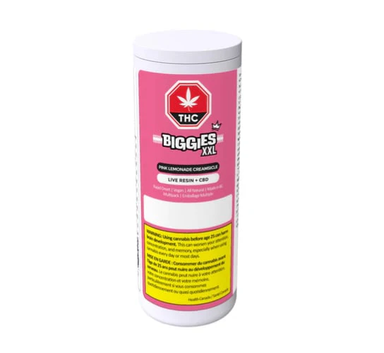 Premium, rapid onset, live resin, high-quality BIGGIES. This multi-pack of six single gummies feature, THE BIG ONE'S, which are 8g oversized gummies with a total of 10mg THC (live resin), 20mg CBD per individual gummy equaling a total of 60mg of THC, 120mg CBD per master container utilizing Wedding Cake x Gelato #33 strain. This flavour profile features sun-ripened lemons with sweet, juicy notes of pink berries, all swirled together with a silky smooth cream. This vibrant medley provides a velvety cream finish, offering a refreshing yet indulgently smooth experience. These gummies are manufactured in-house using cannabis ingredients from British Columbia and are made with all-natural ingredients. Vegan, gluten-free, sulphite-free, and cannabis-terpene enhanced.