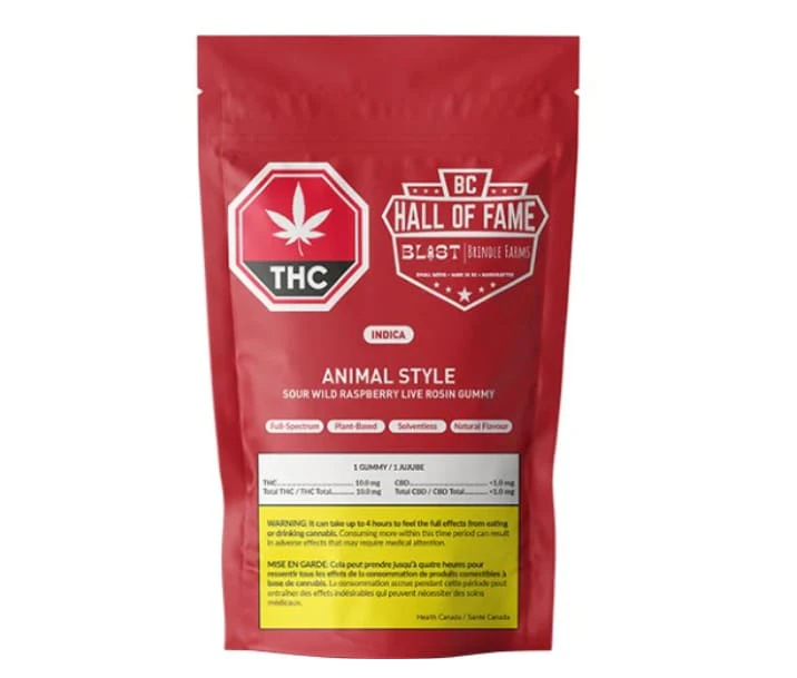 BC HALL OF FAME is an exclusive series by BLAST featuring gummies infused with full-spectrum solventless extracts from top BC micro cultivators. Bred by Swamp Boys Genetics and extracted by Brindle Farms, Animal Style is a potent indica-dominant cross between Animal Cookies and GMO x (Tk x Skunk). The delicious sour wild raspberry flavour enhances this vegan live rosin gummy with a burst of tangy and refreshing raspberry goodness that’s pure bliss for your taste buds.