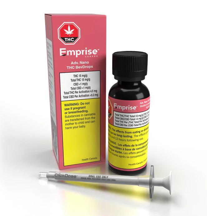 Emprise's Adv. Nano THC BevDrops deliver a 15 mg/g THC-dominant product in water-soluble format. The product is formulated to be added to a beverage for rapid onset within 8-12 minutes.