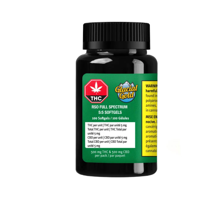 All-natural Glacial Gold RSO Full Spectrum 5:5 Softgels deliver a balanced blend of 5mg THC and 5mg CBD in each premium softgel. Organic hemp oil is infused with RSO cannabis extracts, delivering an all-cannabis formula and a consistent, convenient and discreet experience. Available in large format 100-pack providing 500mg of THC and 500mg of CBD total per bottle.
