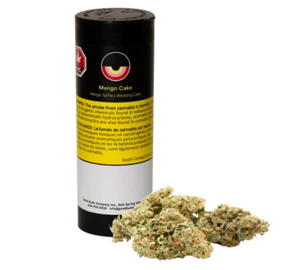 Bred in-house, our Mango Cake is an exotic dessert cross of GOOD BUDS' juicy Mango Taffie cultivar with sweet and creamy Wedding Cake. It leads with classic Mango Taffie smells of ripe mango sweetness with a gassy afterburn, followed by sweet vanilla undertones and a creamy mouthfeel on the exhale. Grown in small batches in living organic soils, each batch of Mango Cake is hand-harvested, hang-dried, and slow cured following artisanal legacy methods. It's then hand-packed into recyclable EcoLite tubes, which use 50% less plastic than average tubes. Terpenes include terpinolene, ocimene, and myrcene.