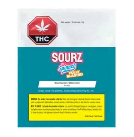 SOURZ by Spinach Fully Blasted Blue Raspberry Watermelon Gummies are packed with 10mg THC per piece. With flavours like electric blue raspberry and refreshing watermelon, send your taste buds soaring. This dual-flavoured gummy is over-the-top with natural flavours and blasted with sour crystals. Enjoy one gummy per pack, 10mg THC total.
