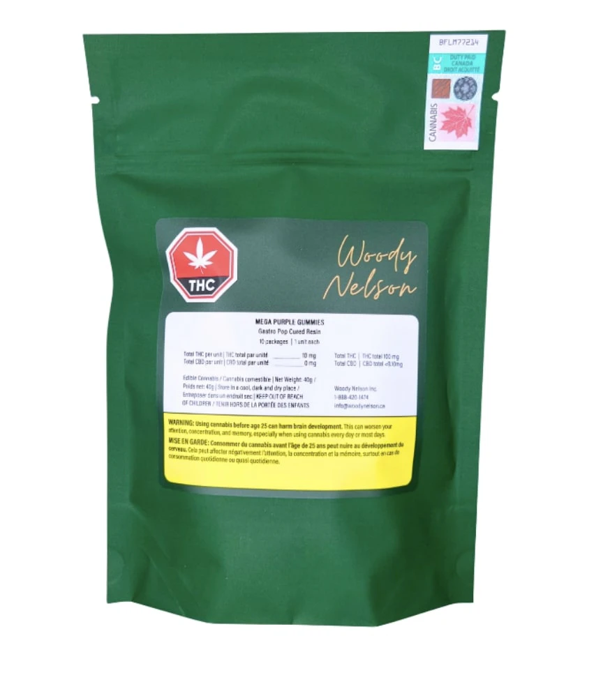 The Mega Purple Gummy Features Gastro Pop By JR Strain, Extracted by wildcard Extracts, and made into Gummies by Elevate Wellness in Port Coquitlam. Each Bag includes 10 x 10mg Resin Infused Gummies (individually Packed) With notes of grape, elderberry and black Currant. Made in BC